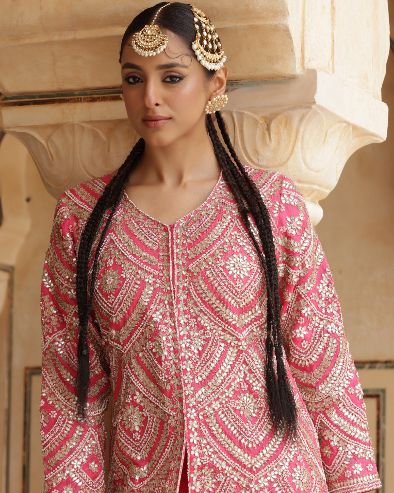 Embrace the grace of pure raw silk and satin in this exquisite jacket and skirt set, embellished with gota patti and marori work for a timeless look.