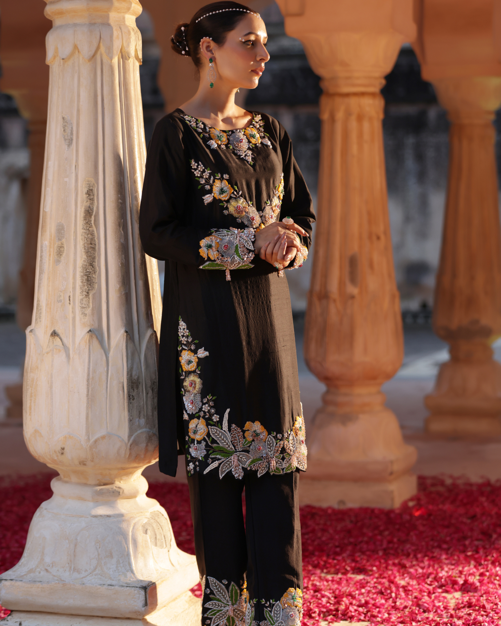 Exude sophistication in our Suit Set made in dupion silk and adorned with exquisite kardana and pearl embellishments that radiate royal charm in a rich black hue.